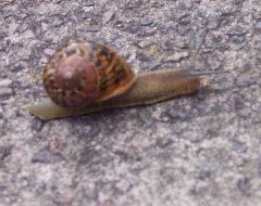 And here's a picture of one of the snails we mentioned in our last installment. Apparently, they are really bad for your garden as they will eat it all up. So said our neighbor anyway, as she chucked one of the little critters onto the road. |
